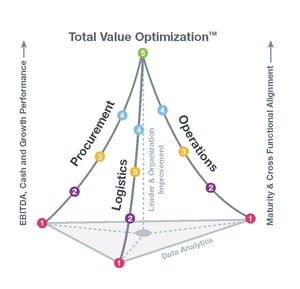 Maine Pointe illustrates Total Value Optimization (TVO) using the TVO Pyramid™. The graphic is a conceptual representation of the critical interdependencies across the parallel, and too often siloed, supply chain functions of strategic procurement, distribution, and retail operations which collectively comprise the buy-make-move-fulfill supply chain.